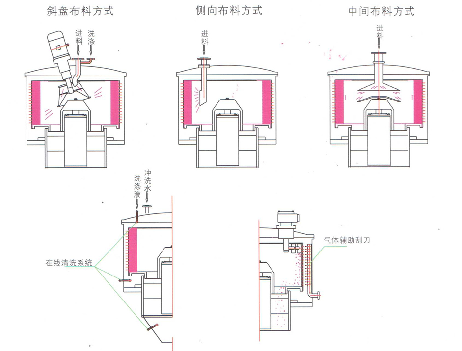 4.布料方式选择:a斜盘布料方式,布料及洗涤更加均匀合理, 避免因布料不均引起震动。b进料管进料(可设置分层进料),水洗管洗涤。